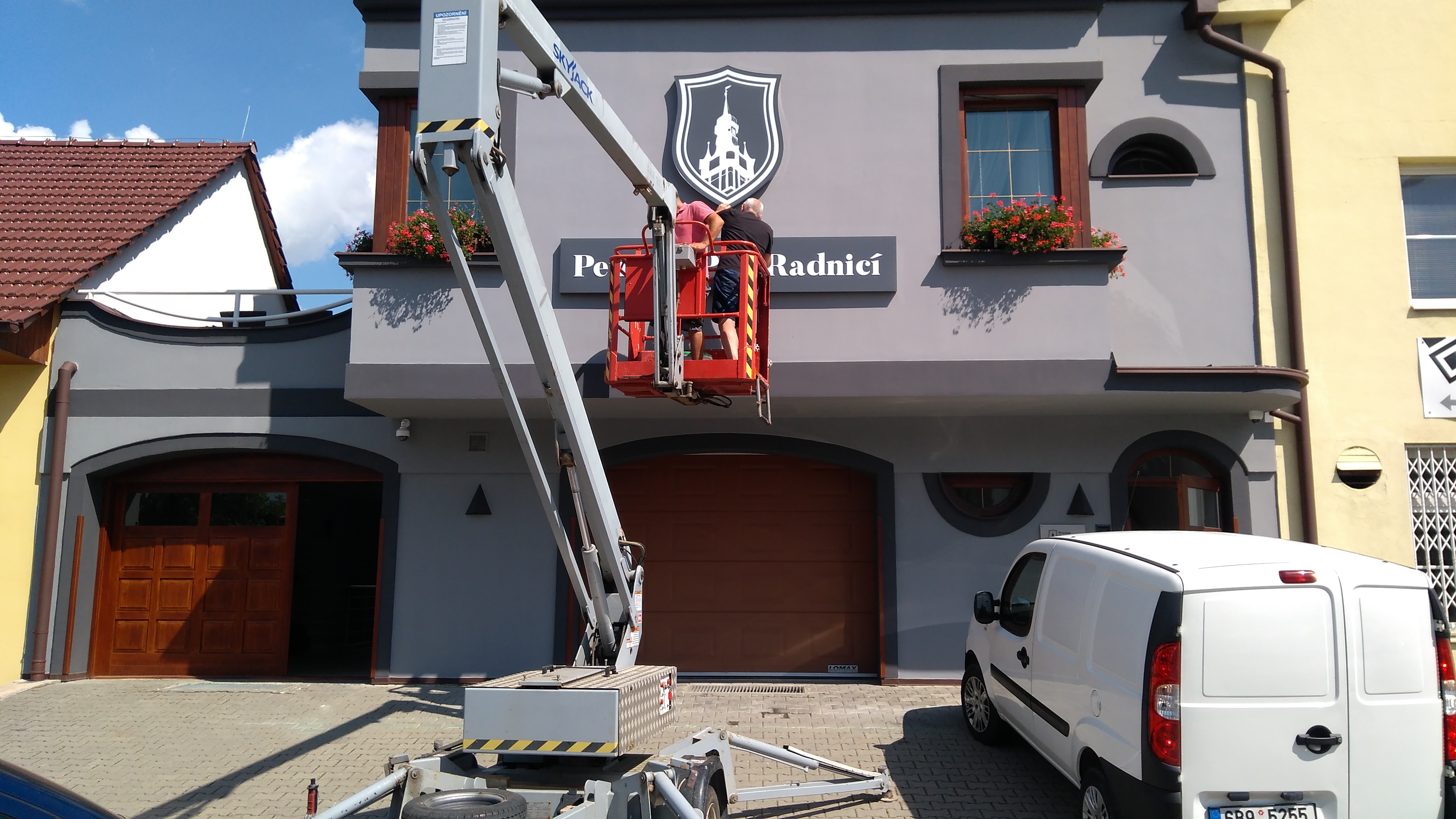 Vysokozdvižná plošina s obsluhou – montáž reklamy (Hustopeče)